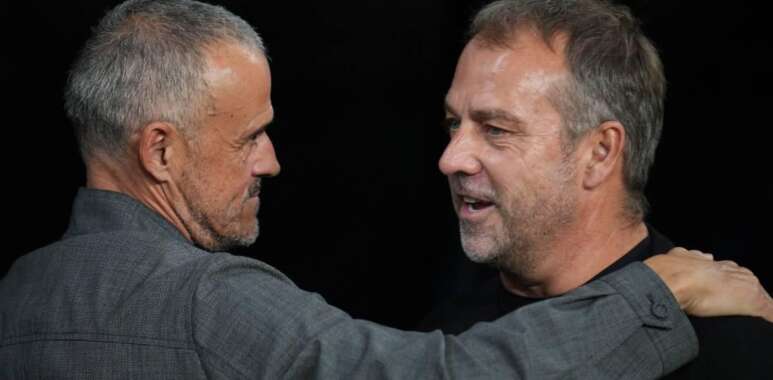 El entrenador del FC Barcelona, Hansi Flick saluda al del PSG, Luis Enrique este miércoles antes del partido de la fase de grupo de la Liga de Campeones que enfrenta al FC Barcelona y al PSG en el Lluís Companys de Barcelona / Siu Wu