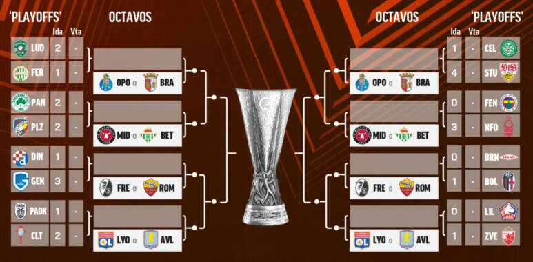 Además, el Genk venció por 1-3 al Dinamo Zagreb y el Bolonia 0-1 al Brann. Los vencedores de esos cruces se medirán al Friburgo o la Roma, con posibilidad por tanto de duelo italiano.